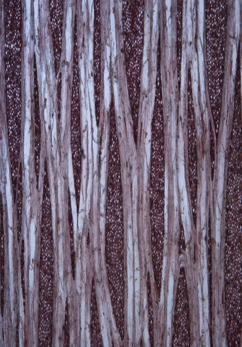 The growth rings are distinct. The wood is diffuse porous. The vessel are small , numerous , uniform in size and evenly distributed; 7-88 / mm2 with 46-102 diameter. The tylosis are common. The axial parenchyma diffuse-in aggregate, narrow bands or lines up to 3 cells wide. The rays are broad, equidistant showing on the radial surface as a glossy, irregular and shinning silver-grain and found 1-3 /mm in cross section and 37.82-77.30 /mm2 in tangential section. The largest wood rays are in height 2719.49 µ (328 cells) and 225.2 µ (22cells) in width. The wood fibers are non-septate 0.69-1.98 mm long,12.8-29.18µ in diameter and have 2.31-6.56µ thick walls.
